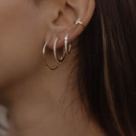Nahaufnahme einer jungen Frau mit Sommersprossen und sonnengebräunter Haut, die große goldene Creolen trägt. Im natürlichen Sonnenlicht in Nürnberg aufgenommen – hochwertiges Editorial-Foto für Schmuck, Fashion und Social Media.