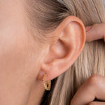 Nahaufnahme einer jungen Frau mit Sommersprossen und sonnengebräunter Haut, die große goldene Creolen trägt. Im natürlichen Sonnenlicht in Nürnberg aufgenommen – hochwertiges Editorial-Foto für Schmuck, Fashion und Social Media.