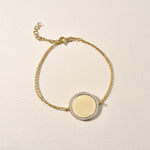 Round mirror bracelet with zircon stones made of 750 gold-plated 925 sterling silver. This piece of jewelry is perfect as a personalized gift, as it can be engraved on the highly polished surface. Give the gift of a personalized massage, a motto, or even a special date.