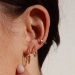 Nahaufnahme einer jungen Frau mit Sommersprossen und sonnengebräunter Haut, die große goldene Creolen trägt. Im natürlichen Sonnenlicht in Nürnberg aufgenommen – hochwertiges Editorial-Foto für Schmuck, Fashion und Social Media.