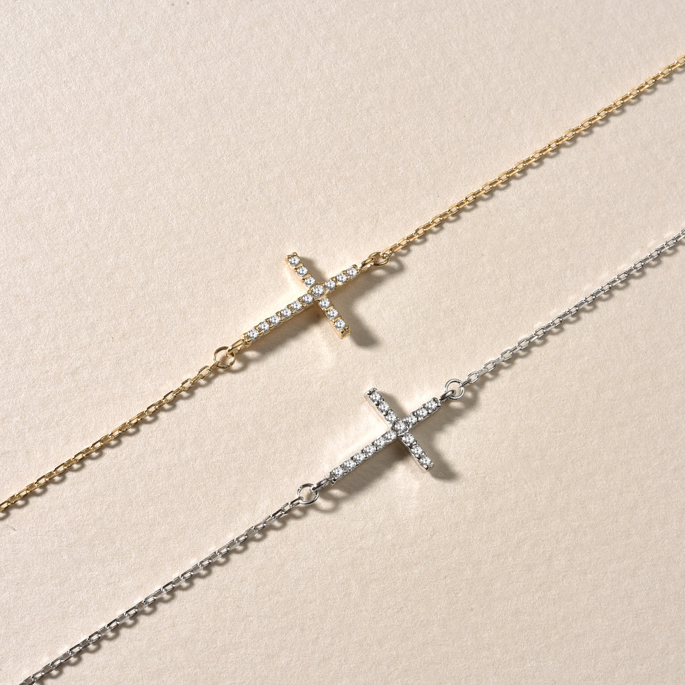 Kreuz Zirkonia Armkette in Gold und Silber – Vergleich der Varianten.