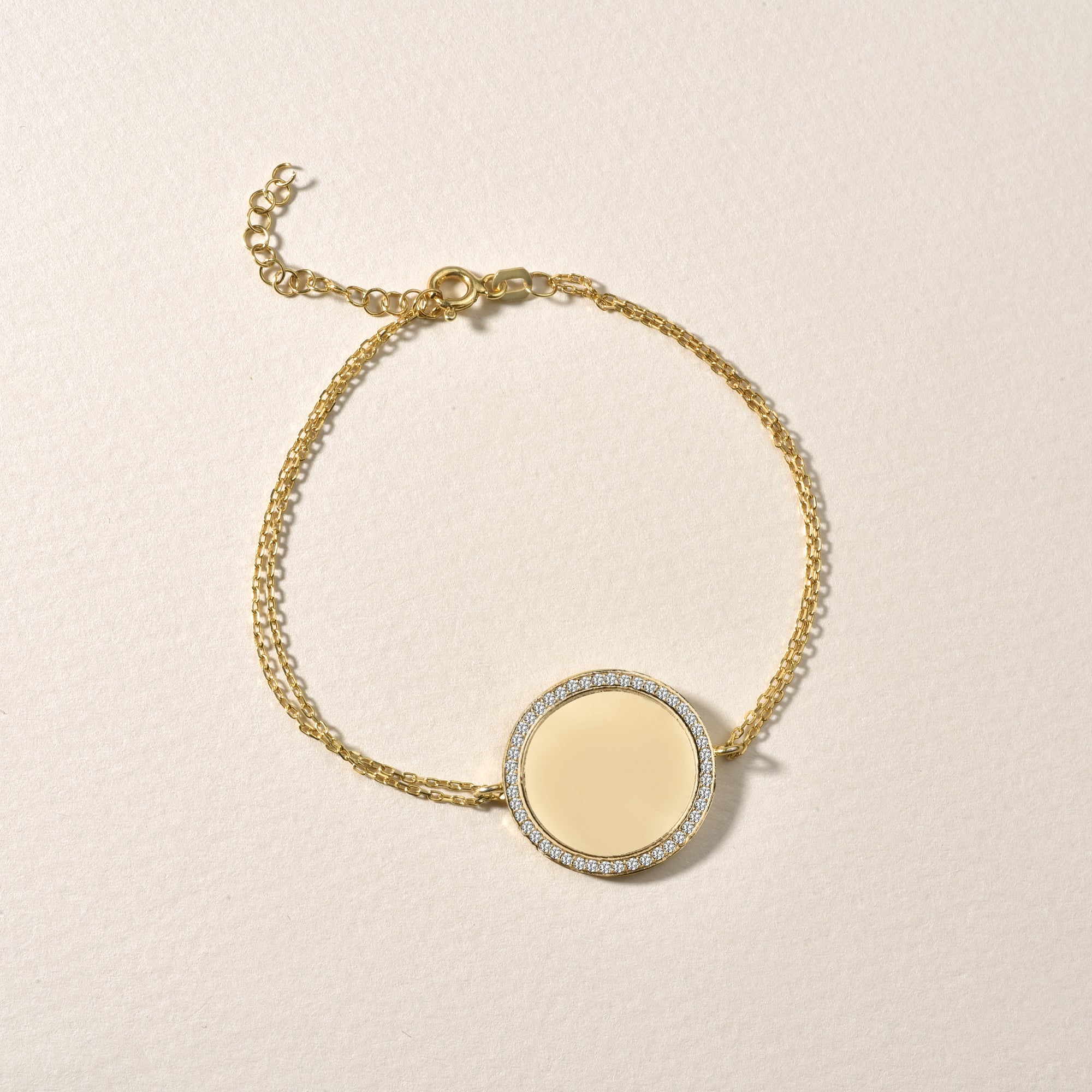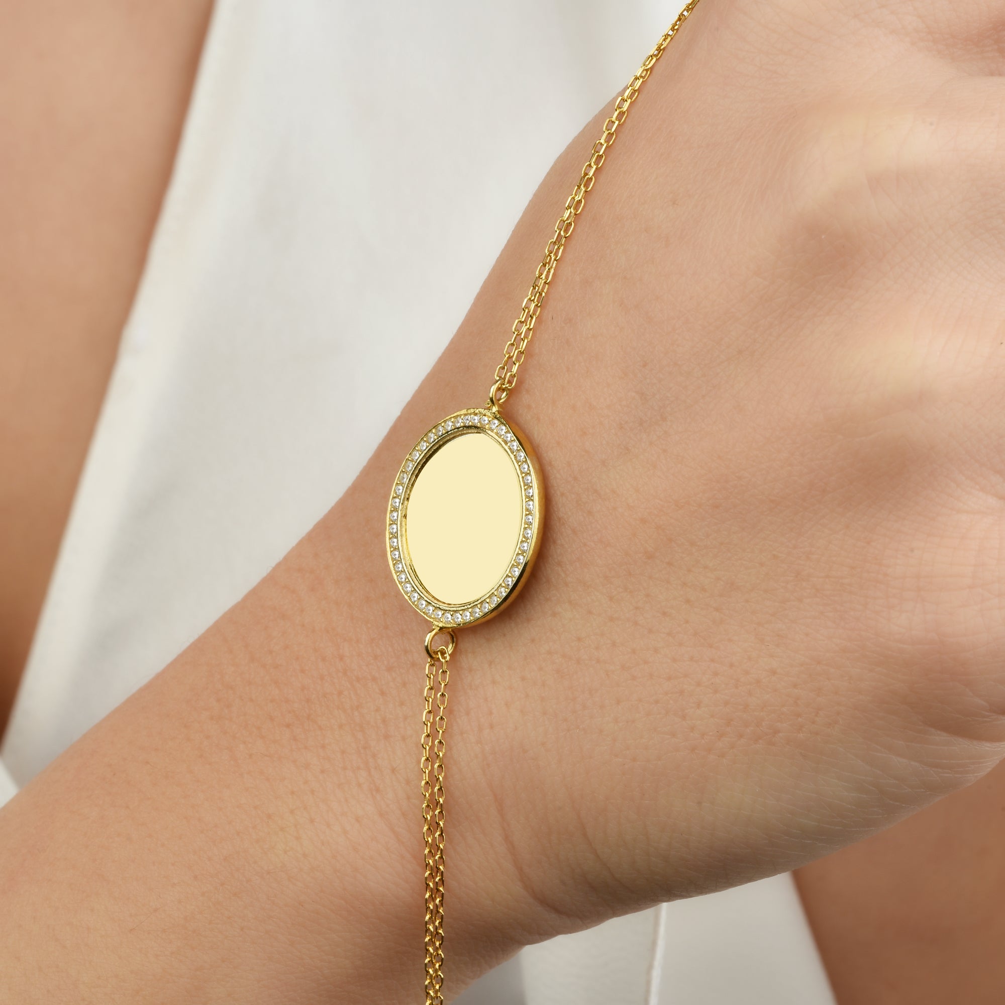 Mirror Gravur Armkette Gold mit runder Gravurplatte und Zirkonia-Rand auf hellem Hintergrund.