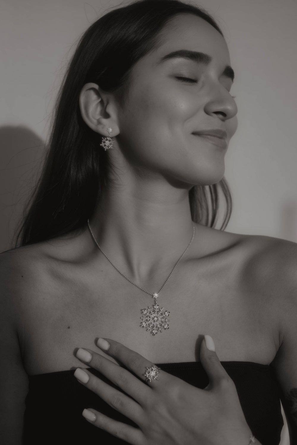 Frau trägt Snowflake Ice Halskette, Ohrringe und Ring in Silber mit funkelnder Schneeflocke.