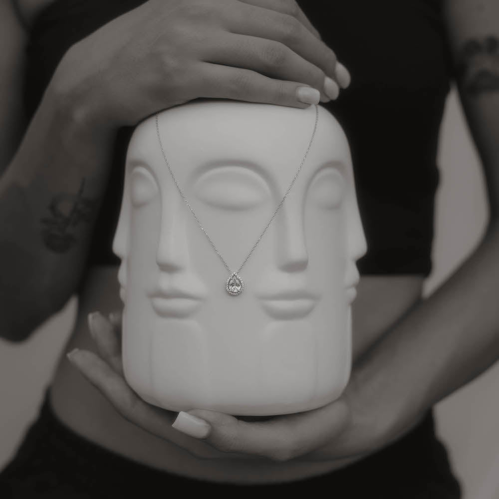 Silberne Drops Halskette mit Zirkonia an weißer Designvase.