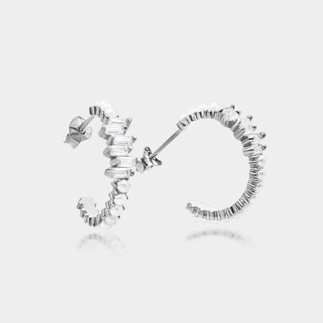 Pearl X Baguette Ohrringe aus 925 Silber mit Perlen und Zirkonia auf weißem Hintergrund.