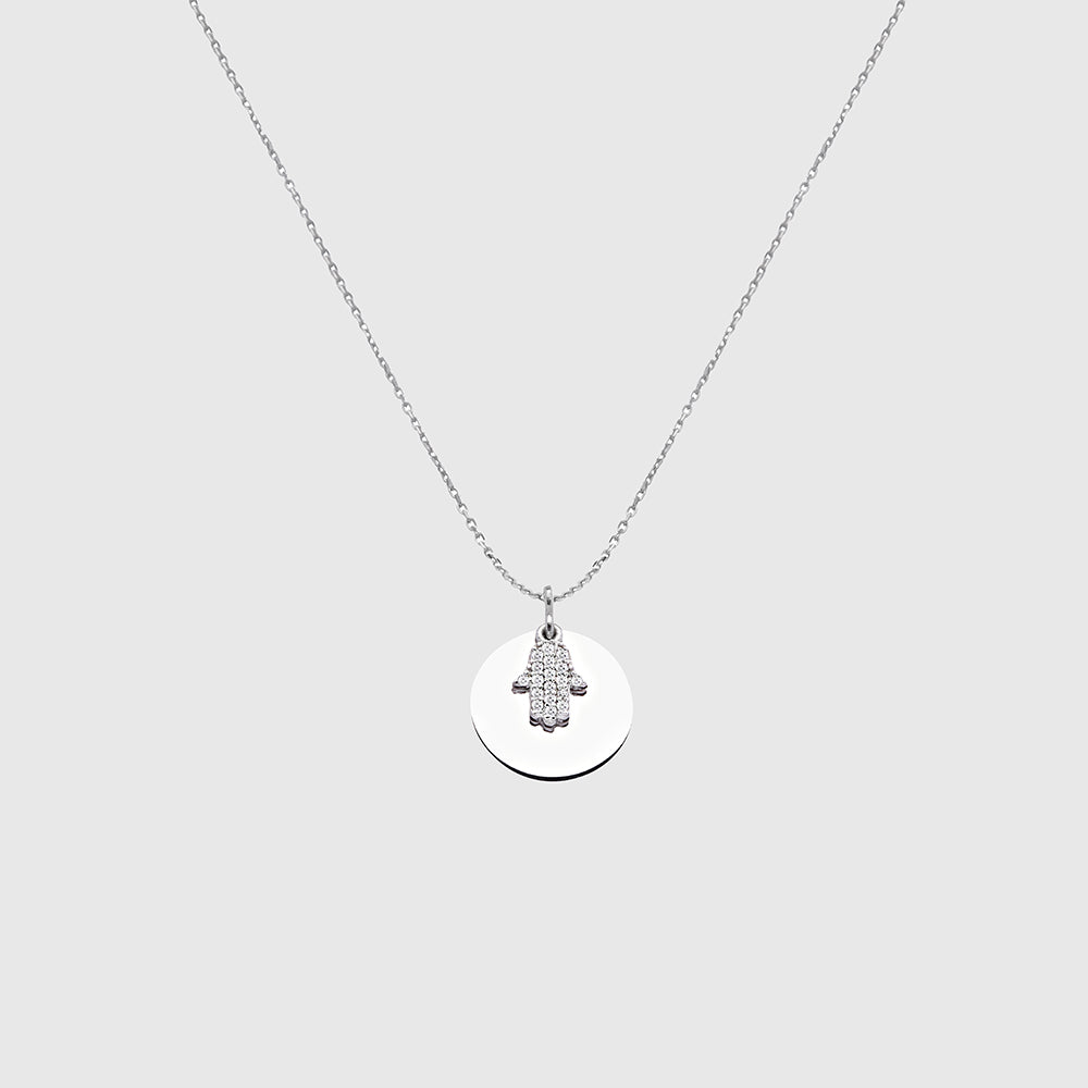 Silberne runde Halskette mit Fatima Anhänger und weißen Zirkonia-Steinen von Dkeniz.