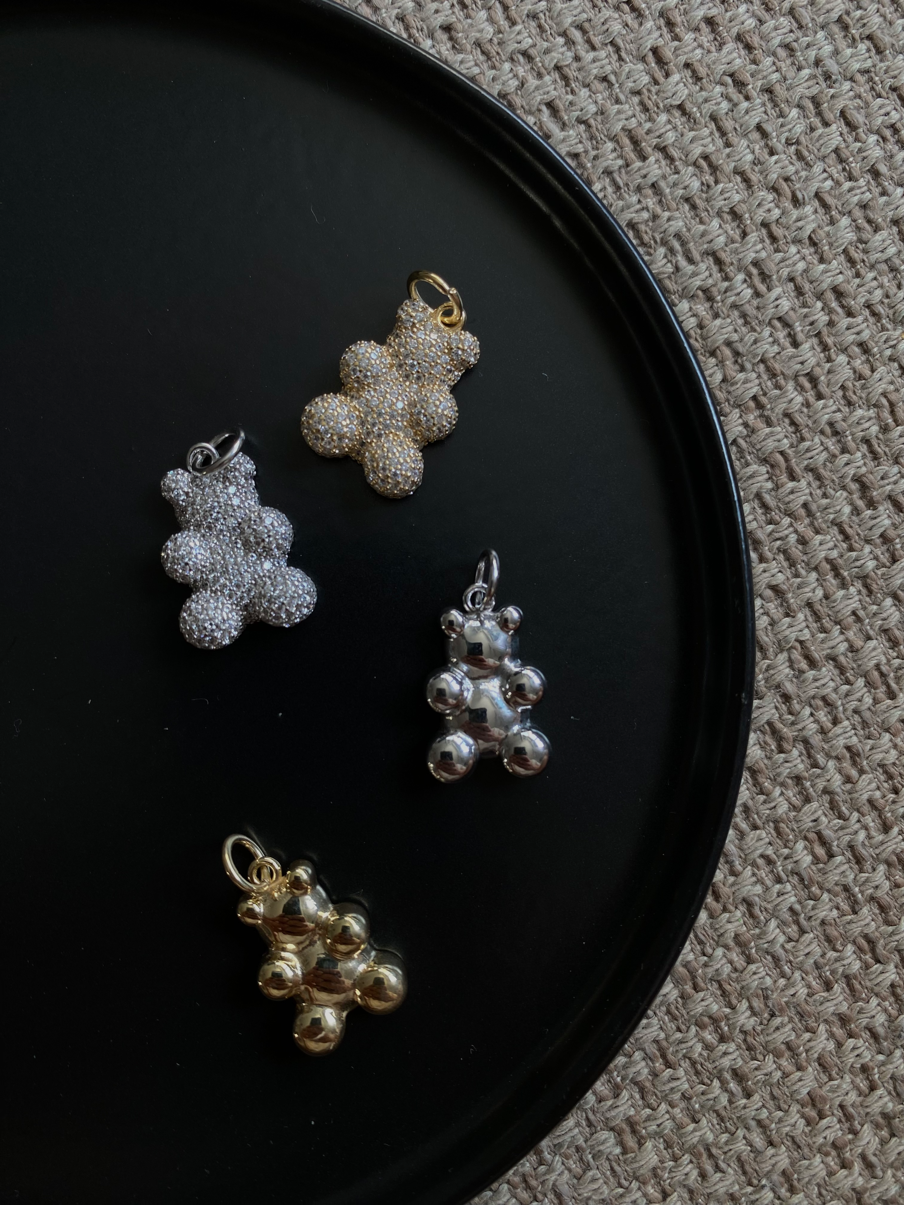 Vier Sparkling Bear Anhänger in Silber, Gold und glänzendem Metall auf schwarzem Teller.