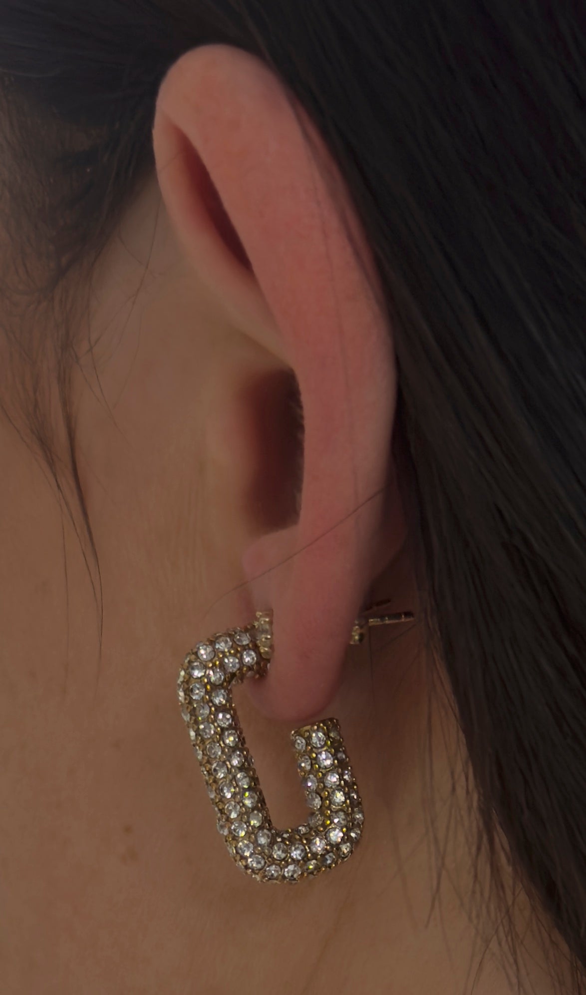 Eckiger Zirkonia Hoggie in Gold aus Edelstahl am Ohr getragen, pavé-besetzt, moderne U-Form.